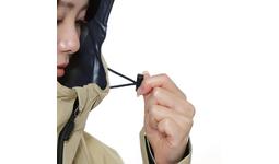 先端つば部分の形状をキープする特殊なパイプを埋め込むことで、フードを絞っても雨水で顔を濡らしません。