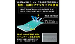 VASTLANDとガーメント工場が共同で独自開発した「撥水・防水」生地を使用しました。また、縫い目からの水滴の浸入を防ぐ、「シームテープ加工」を採用しています。