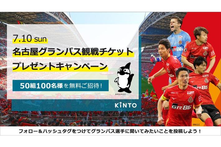 株式会社KINTO(本社:愛知県名古屋市、代表取締役社長:小寺 信也)は、7月10日(日)に開催される「2022明治安田生命J1リーグ第21節 名古屋グランパス vs 清水エスパルス」に協賛いたします。同日は『KINTO DAY』と題し、ファンの皆さまに楽しんでいただけるようKINTO特設ブースを出展いたします。また、今回の協賛に併せて「KINTO×名古屋グランパス 観戦チケットプレゼントキャンペーン」も実施いたします。抽選で50組100名様に観戦ペアチケットをプレゼントしますので、ぜひ、奮ってご応募ください。