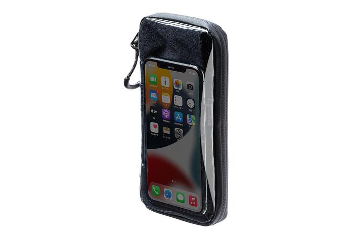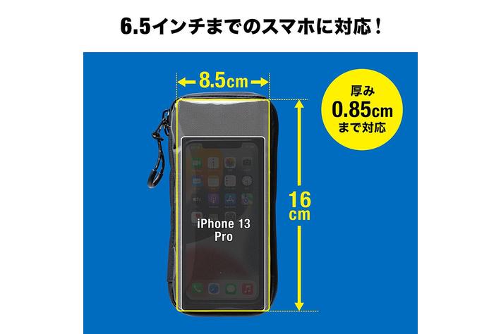 ポーチに入れたままスマートフォンの操作が可能で、iPhoneなど6.5インチまでのスマートフォンに対応しています。