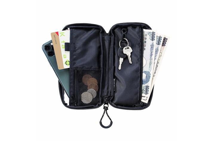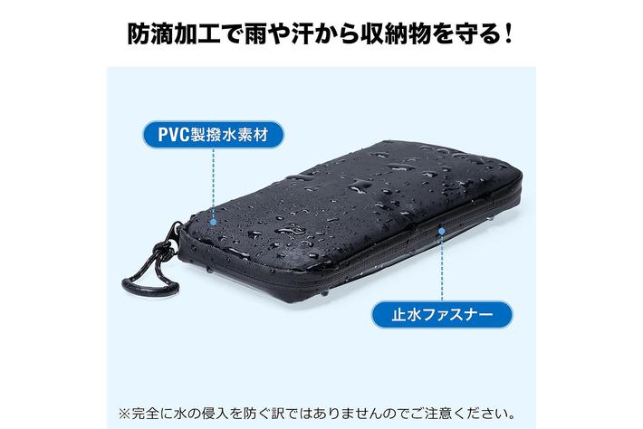止水ファスナー、PVC製耐水素材の防滴仕様で、スマートフォンやお札などが、雨や汗で濡れるのを防ぎます。