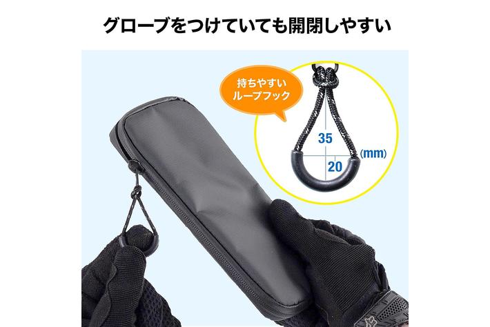 サイクルグローブをしたままでも開閉しやすい、ループフック仕様です。