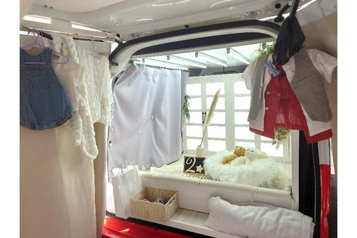 移動写真館「hihi」は、写真館のような環境の車両内でプロのカメラマンによる写真撮影を実現、新生児の外出による移動リスクや出産後間もない母親の体への負担を軽減いたします。