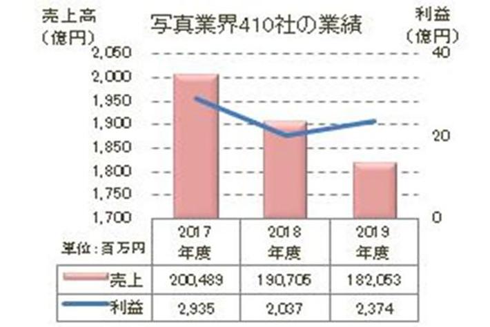スマートフォンによる撮影が一般化し、写真館や関連店舗の減少など写真業界は減退の打撃を避けられません。写真業界410社の売上高は、2017年度は2,004億8,900万円でしたが、2018年度は1,907億500万円(前年度比4.8%減)、2019年度は1,820億5,300万円(同4.5%減)と毎年約5%ずつ減少しているのが現状です。