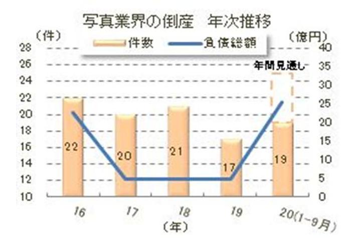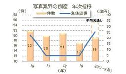 写真業界の倒産は、2020年1月-9月合計で19件(同年同期比72.7%増)と急増。新型コロナ感染拡大で営業自粛や需要急減も重なり、新型コロナ関連倒産も3件発生しています。負債総額は、2020年1月-9月で25億5,600万円(同667.5%増)と前年同月比約8倍増と大幅に増加しました。