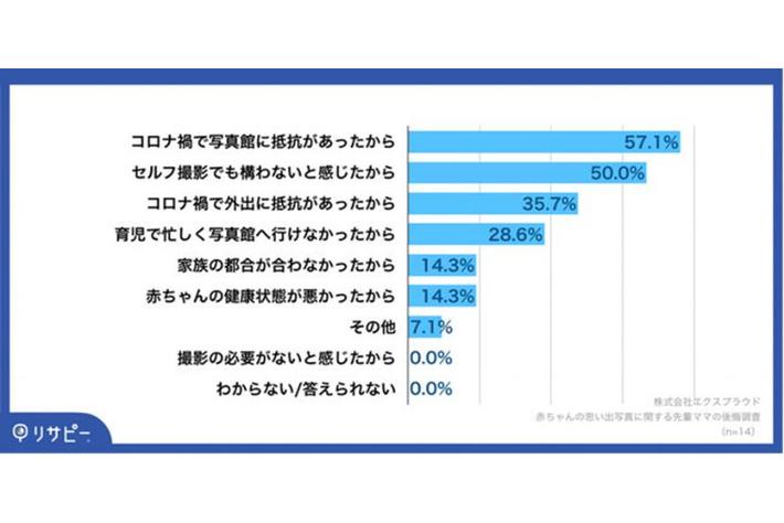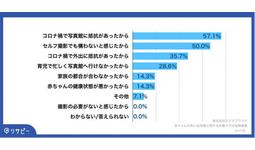 お子さまが0才の時に、プロカメラマンによる写真撮影ができなかった理由を尋ねたところ、コロナが理由で写真館に抵抗があったという回答が全体の57.1%という結果で半数以上を占めました。また育児で忙しくて写真館へ行けなかったという回答が全体の28.6%を示しました。以上の結果から、0歳児を持つ半数以上の母親は写真館でのプロカメラマンによる記念撮影を望んでいることが推測されます。
