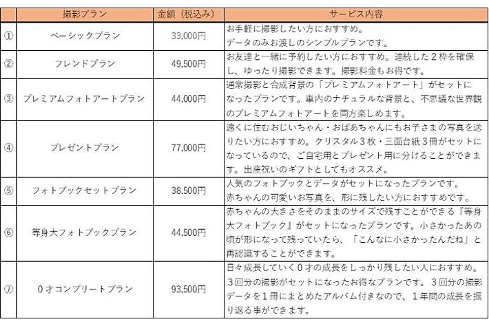 手軽にお子さまを撮影したい方向けデータのみお渡しのシンプルなプラン(33,000円)から、通常撮影と合成背景の両方を楽しめるプラン(44,000円)、また遠方在住のおじいちゃん・おばあちゃんに記念写真を送ったり、出産祝いのギフトに最適なプラン(77,000円)などを準備いたしました。なお(1)、(2)については7月1日よりサービス開始、(3)から(7)については順次開始いたします。
