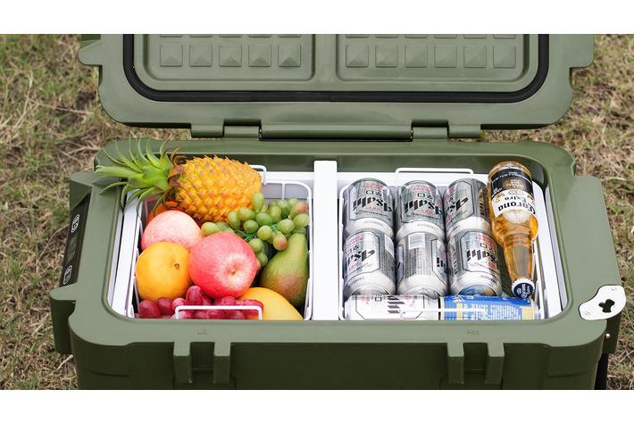 市販品と比べると回転成形プロセスと6cmある厚さの断熱材を採用しているため、消費電力が抑えられることで省エネを実現!「冷却」ができるポータブル冷蔵庫・冷凍庫・製氷機用だけでなく、「保冷」ができるクーラーボックスも使うことで、電源切れでもキンキンに冷えたドリンクを楽しむことができます。レジャーや災害時に大活躍します。