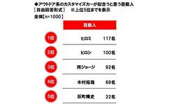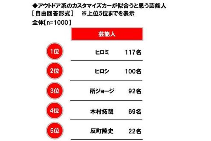 ホンダアクセス調べ アウトドア系のカスタマイズカーが似合うと思う芸能人 1位「ヒロミさん」2位「ヒロシさん」3位「所ジョージさん」