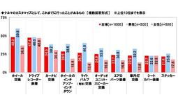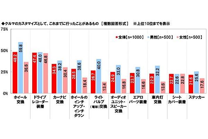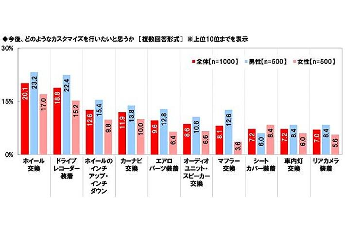 男女別にみると、男性では「ホイール交換」が23.2%、「ドライブレコーダー装着」が22.4%、「ホイールのインチアップ・インチダウン」が15.4%、「エアロパーツ装着」が12.8%、「マフラー交換」が12.6%と、女性(順に17.0%、15.2%、9.8%、6.4%、3.6%)と比べて5ポイント以上高くなりました。