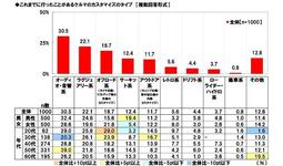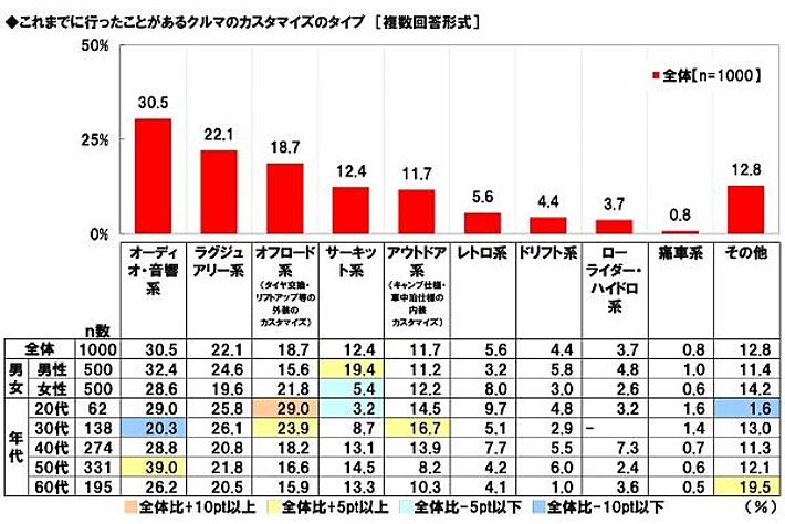 これまでに行ったことがあるカスタマイズのタイプ 「オーディオ・音響系」31%、「ラグジュアリー系」22%、「オフロード系」19%、「サーキット系」「アウトドア系」12% 20代・30代では「オフロード系」が高い傾向