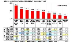 年代別にみると、20代と30代では「オフロード系(タイヤ交換・リフトアップ等の外装のカスタマイズ)」(順に29.0%、23.9%)が他の年代と比べて高くなりました。若年層には、ワイルドさを演出するようなカスタマイズに関心を持っている人が多いようです。