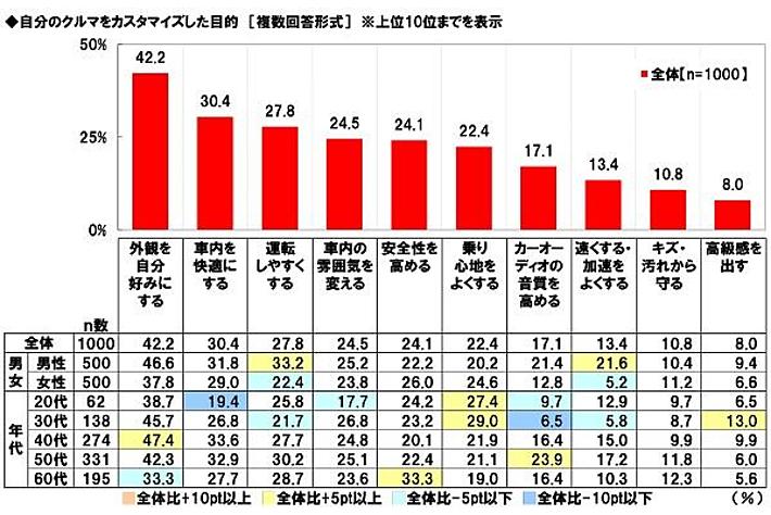 クルマをカスタマイズした目的 「外観を自分好みにする」42%、「車内を快適にする」30%、「運転しやすくする」28% 50代では「カーオーディオの音質を高める」、60代では「安全性を高める」が高い傾向