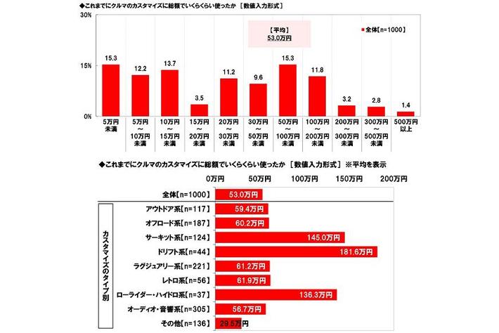 これまでにクルマのカスタマイズに総額でいくらくらい使った? 平均53.0万円 ドリフト系カスタマイズをした人では平均181.6万円