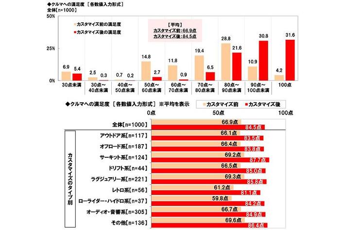 カスタマイズのタイプ別にみると、クルマへの満足度の上昇幅はローライダー・ハイドロ系が24.4点(59.8点→84.2点)で最も大きくなり、レトロ系が19.9点(61.2点→81.1点)、サーキット系とドリフト系が18.5点(順に69.2点→87.7点、66.5点→85.0点)で続きました。