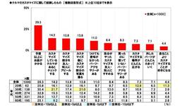 全回答者(1,000名)に、クルマのカスタマイズに関してこれまでにどのような経験をしたことがあるか聞いたところ、「予想以上にお金がかかる」(29.3%)が突出して高くなりました。見積もりを受け取って金額に驚いた人や、ほしいパーツ・必要なパーツが増え当初の予定よりも金額が高くなった人が多かったのではないでしょうか。次いで高くなったのは、「カスタマイズしているクルマがあるとチェックする」(14.2%)、「カスタマイズ部分を友人・知人にアピールする」「カスタマイズ後にカスタマイズ部分の写真を撮る」(いずれも13.8%)、「つけても意味がなかったパーツ・アクセサリーがある」(11.0%)でした。