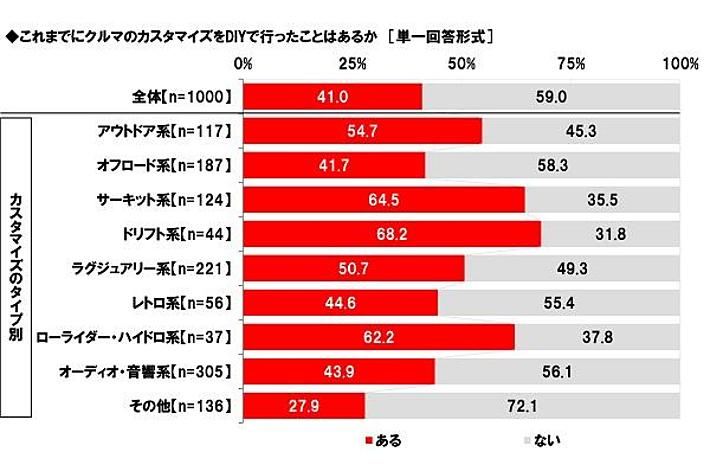 全回答者(1,000名)に、これまでにクルマのカスタマイズをDIYで行ったことはあるか聞いたところ、「ある」は41.0%、「ない」は59.0%となりました。専門業者に依頼するのではなく、自身でパーツや材料を買って、自分の手でカスタマイズを行ったことがあるという人は少なくないようです。