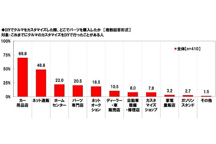 DIYでクルマをカスタマイズしたときのパーツの購入場所 「カー用品店」がダントツ、2位「ネット通販」