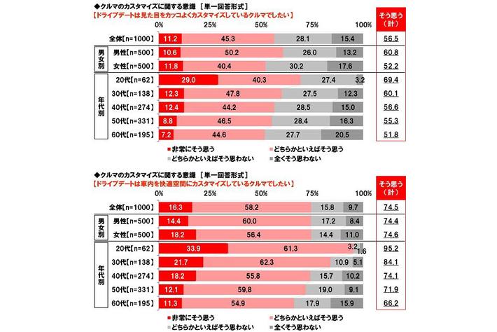 「ドライブデートは見た目をカッコよくカスタマイズしているクルマでしたい」57%、20代では69%