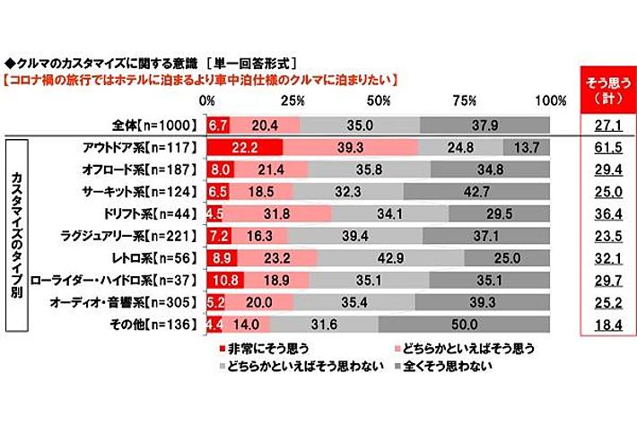 「コロナ禍の旅行ではホテルより車中泊仕様のクルマに泊まりたい」アウトドア系カスタマイズをした人では62%
