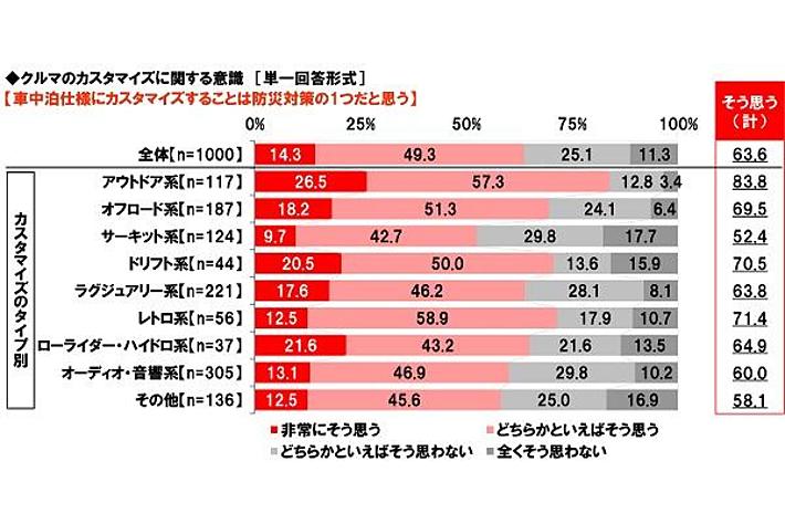「車中泊仕様にカスタマイズすることは防災対策の1つだと思う」アウトドア系カスタマイズをした人では84%