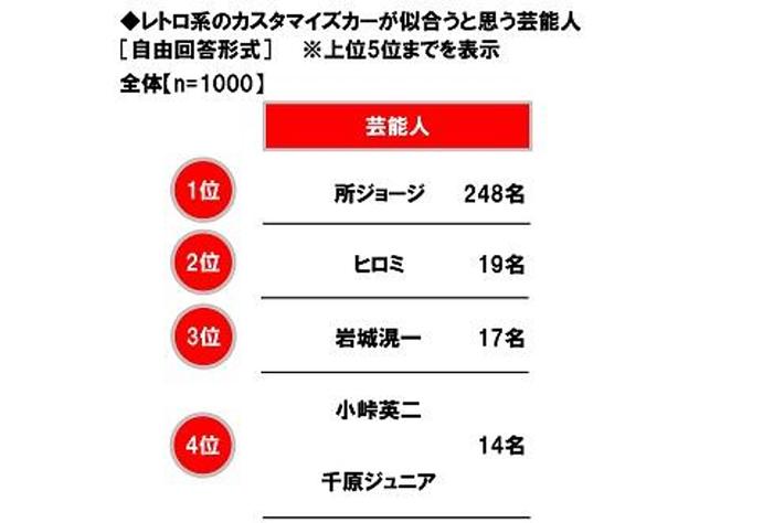 レトロ系のカスタマイズカーが似合うと思う芸能人 TOP5は「所ジョージさん」「ヒロミさん」「岩城滉一さん」「小峠英二さん」「千原ジュニアさん」