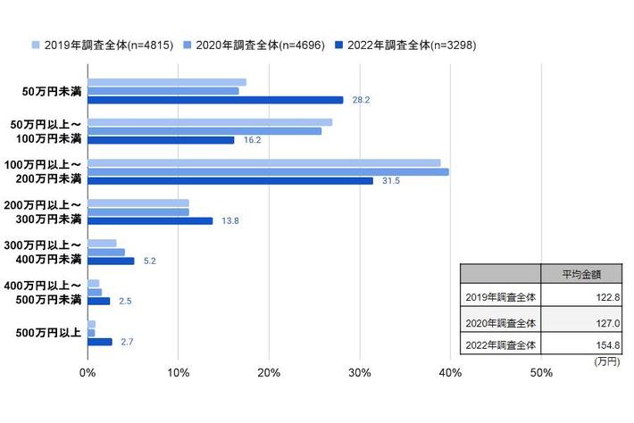 「50万円未満」割合が大幅増加し、「50万円以上~100万円未満」の割合が減少。また「200万円以上~」の割合は増加傾向であり、かつ二極化傾向。