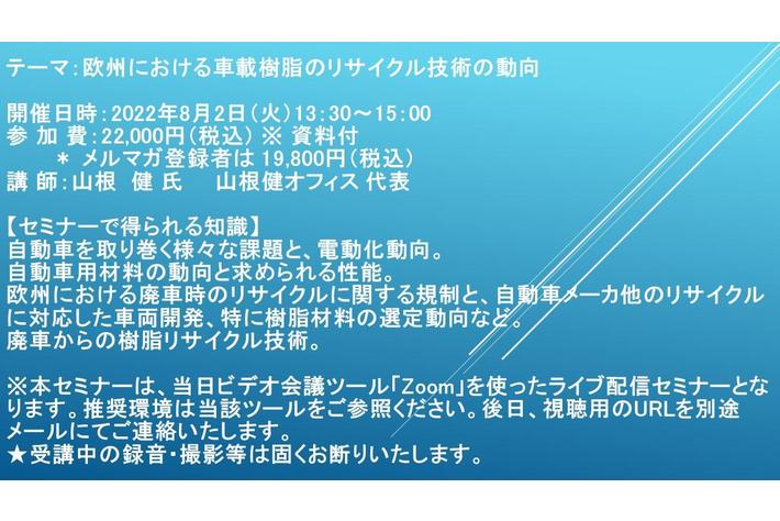 先端技術情報や市場情報を提供している(株)シーエムシー・リサーチ(千代田区神田錦町: https://cmcre.com/ )では、 各種材料・化学品などの市場動向・技術動向のセミナーや書籍発行を行っておりますが、 このたび「欧州における車載樹脂のリサイクル技術の動向」と題するセミナーを、 講師に山根 健 氏 山根健オフィス 代表)をお迎えし、2022年8月2日(火)13:30より、 ZOOMを利用したライブ配信で開催いたします。 受講料は、 一般:22,000円(税込)、 弊社メルマガ会員:19,800円(税込)となっております(資料付)。