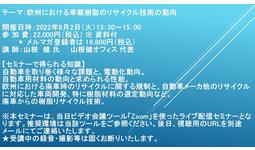 先端技術情報や市場情報を提供している(株)シーエムシー・リサーチ(千代田区神田錦町: https://cmcre.com/ )では、 各種材料・化学品などの市場動向・技術動向のセミナーや書籍発行を行っておりますが、 このたび「欧州における車載樹脂のリサイクル技術の動向」と題するセミナーを、 講師に山根 健 氏 山根健オフィス 代表)をお迎えし、2022年8月2日(火)13:30より、 ZOOMを利用したライブ配信で開催いたします。 受講料は、 一般:22,000円(税込)、 弊社メルマガ会員:19,800円(税込)となっております(資料付)。