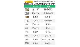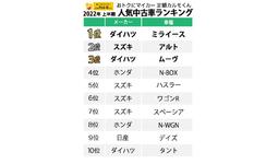 新車ではランクインしていたヤリスやライズは10位圏外。TOP10、すべて軽自動車