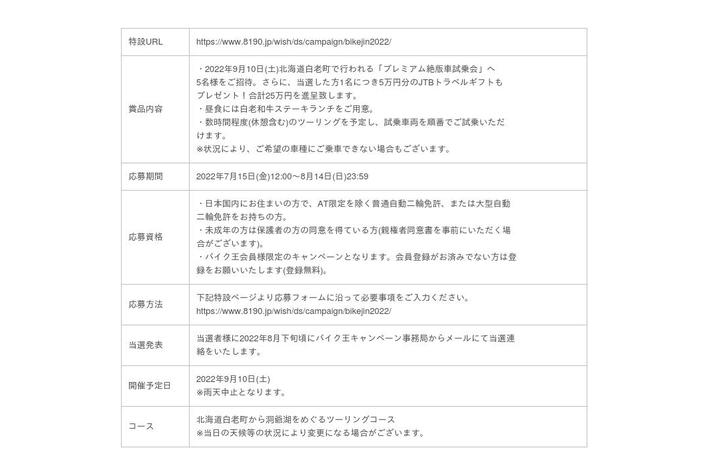 「まだ世界にない、感動をつくる。」をコーポレートミッションに掲げ、ビジョンである「バイクライフの生涯パートナー」の実現に向けて、事業を展開する株式会社バイク王&カンパニー(代表取締役社長執行役員:石川秋彦、本社:東京都港区、証券コード:3377、以下「当社」)は、2022年9月10日(土)に北海道白老町にて、『プレミアム絶版車試乗会in北海道・白老』(以下「当試乗会」)を開催いたします。