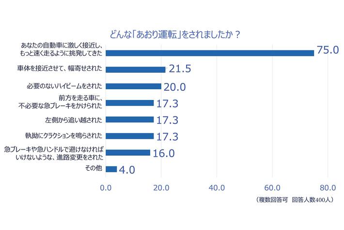 あおり運転に遭遇した時に受けた被害について聞いたところ、車体を接近させる挑発行為が最も多く、具体的には、「あなたの自動車に激しく接近し、もっと速く走るように挑発してきた」(75.0%)、「車体を接近させて、幅寄せされた」(21.5%)となりました。