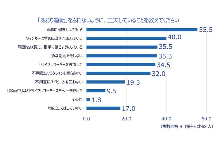 あおり運転を受けたことがあるドライバーに、あおり運転をされないように工夫していることを聞いたところ、「車間距離をしっかりとる(55.5%)」、「ウィンカーは早めに出すようにしている(40.0%)」、「周囲をよく見て、相手に譲るようにしている(35.5%)」と続き、周りのドライバーを気遣い、刺激しない運転を心がけている人が目立ちました。