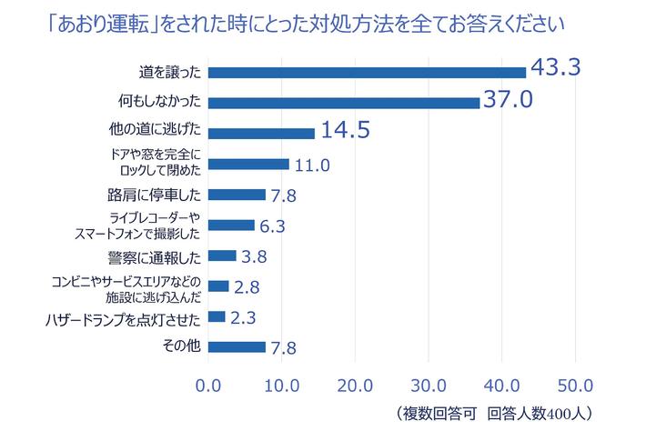 また、あおり運転を受けたときにとった対処法は、「道を譲った」が43.3%で最多。「何もしなかった(37.0%)」、「他の道に逃げた(14.5%)」と続き、「やり過ごす」対応をとったドライバーが目立つ結果となりました。