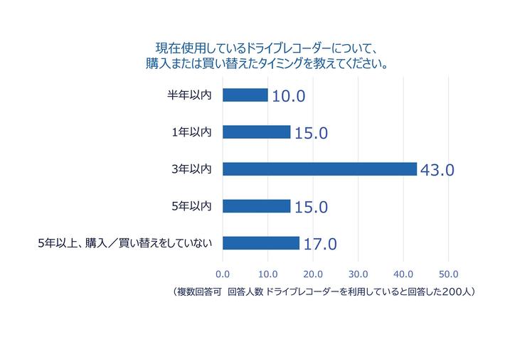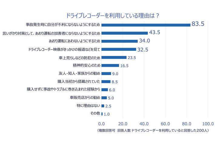 現在利用しているドライブレコーダーについて、購入または買い替えたタイミングを聞いたところ、「直近1年以内」が25%の結果になりました。また、ドライブレコーダーを利用している理由は「事故発生時に自分が不利にならないようにするため(83.5%)」が最も多く、「あおり運転にあわないようにするため」と答えたドライバーは34%と3番目に多い結果となりました。
