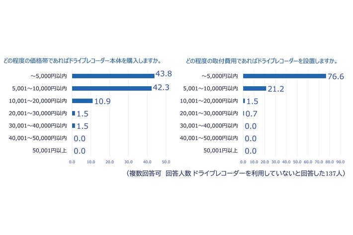一方、ドライブレコーダーを取り付けていない理由は「購入したいがコストがかかるため(68.5%)」が第1位となり、 「購入したいがコストがかかるため」と回答したドライバーに、「どの程度の価格であれば購入、設置しますか」という問いには、本体購入は10,000円以内、取付費用は5,000円以内が多い結果となりました。