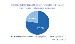 近年の報道を受けて、あおり運転を受けないよう、以前よりも意識して運転しているドライバーは77.0%。