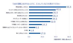 あおり運転を受けたことがあるドライバーに、あおり運転をされないように工夫していることを聞いたところ、「車間距離をしっかりとる(55.5%)」、「ウィンカーは早めに出すようにしている(40.0%)」、「周囲をよく見て、相手に譲るようにしている(35.5%)」と続き、周りのドライバーを気遣い、刺激しない運転を心がけている人が目立ちました。