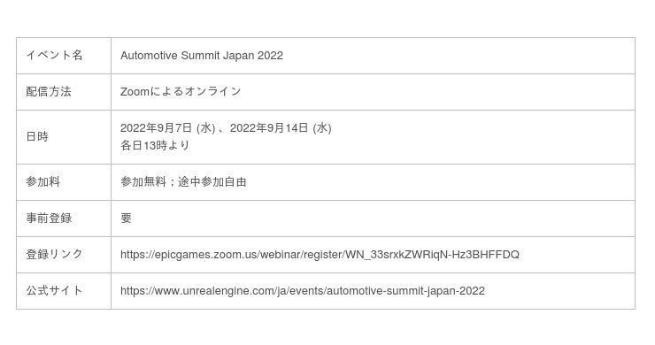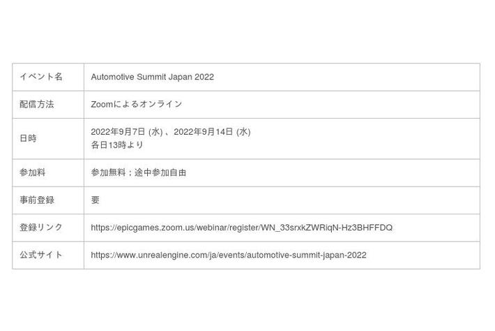 自動車業界向けのUnreal Engineオンライン イベント Automotive Summit Japan 2022 開催のお知らせ