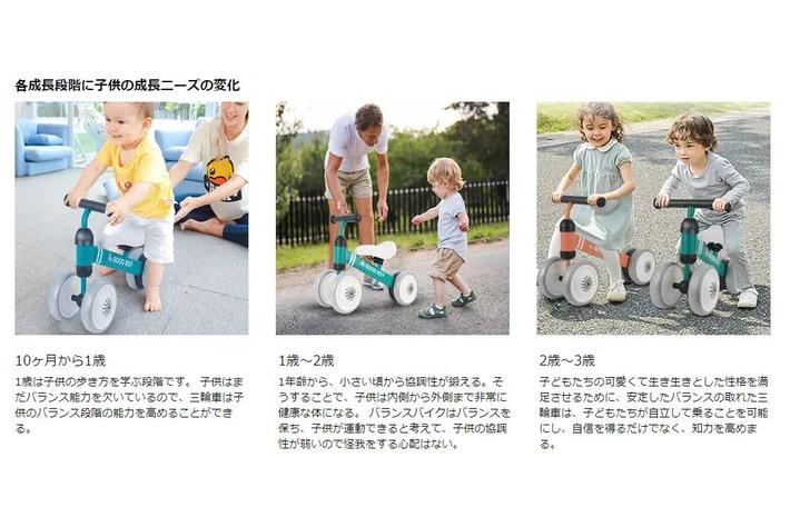 2、子供が足を蹴って一歩一歩前へ進んでいるうちに自然にバランス感覚が養われ、小さい頃から協調性が鍛えることができます。