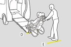 A:車両側面から約25cmの目安 B:リアバンパーから約0.5mの目安 C:テールゲート開閉可能の目安 D:スロープ後端の目安 E:車いす乗降スペースの目安 |