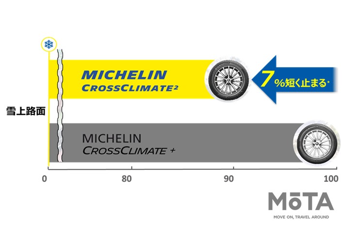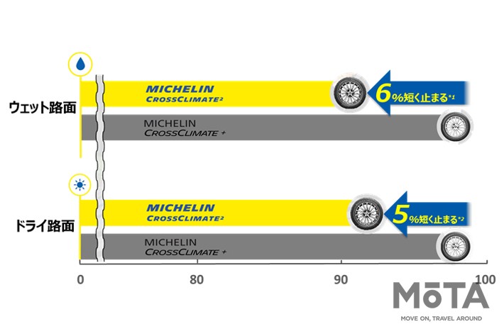 「MICHELIN CROSSCLMATE+」との比較では、3つのブレーキ性能が向上。
