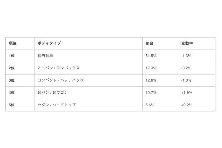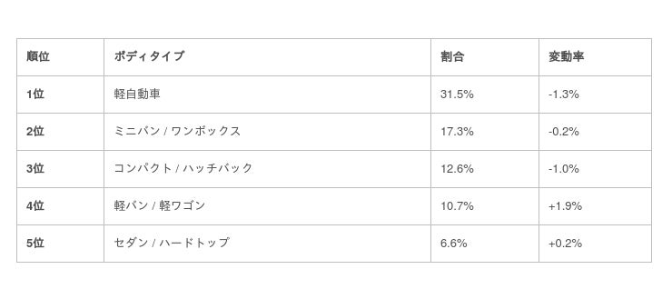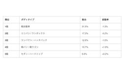 国産車のボディタイプ別ランキングは先月から順位の変動はありませんでした。上位5ボディタイプの販売割合を見ると、3位までのボディタイプのシェア率が低くなっており、4,5位のボディタイプのシェア率が高くなっています。