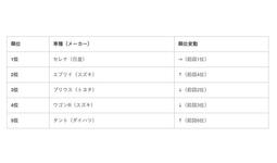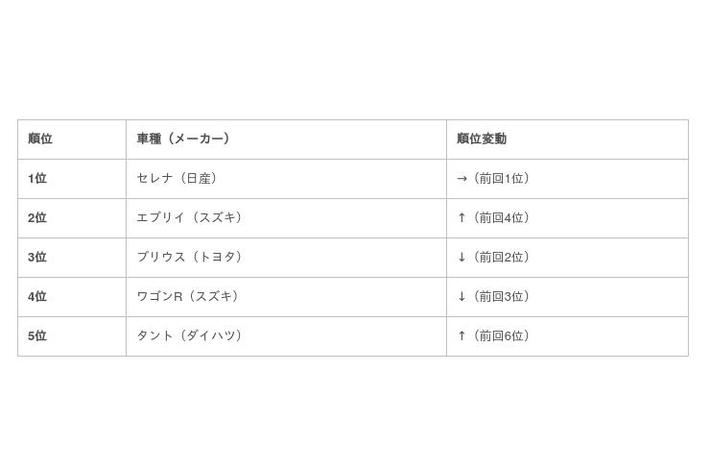 国産車の車種別ランキングを見てみると、セレナ(日産)、エブリイ(スズキ)、プリウス(トヨタ)、ワゴンR(スズキ)、と、上位4車種は変わらない結果ですが、順位が少し変動しました。しかしその中でもセレナは2022年3月から1位を維持し続けています。