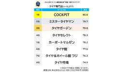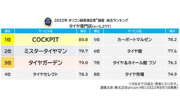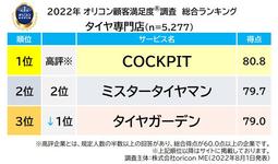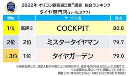 2022年 満足度の高い『タイヤ専門店』ランキング発表|【COCKPIT】が初の総合1位に 全8評価項目でも1位を獲得、特に「取付・交換作業」で85.2点の高評価
