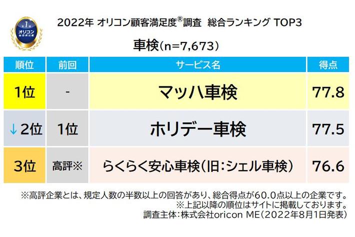 《調査概要》 2022年 オリコン顧客満足度(R)調査 車検 (2022年8月1日発表)