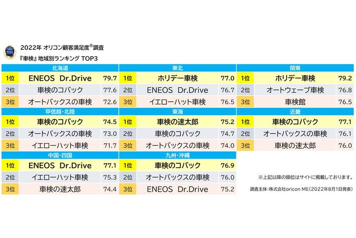 なお、総合ランキングで1位を獲得した【マッハ車検】は、地域別では有効回答者数が規定に届かなかったため、ランク外となっています。