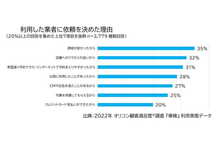 次に、“その業者に依頼した決め手”を複数回答方式で聴取したところ、「価格が安かったから」(35%)、「店舗へのアクセスが良いから」(32%)、「希望通り予約できた・インターネットで予約を取りやすかったから」(31%)と続きました。また、「以前に利用したことがあったから」と答えた方も28%を占めています。