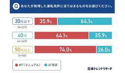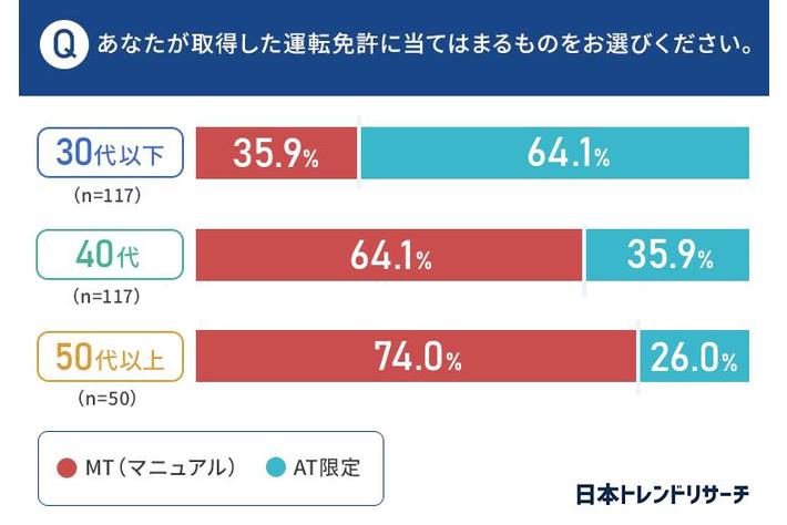30代以下は「AT限定」のほうが多く、40代、50代以上では「MT」のほうが多い結果になりました。
