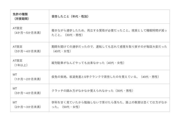 6割以上の方が3か月未満と回答しましたが、免許を取得するまでに苦労したことはあるのでしょうか。